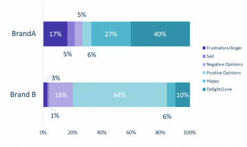 Given this pattern, it perhaps will not surprise you to learn that Brand A is a mature, well-known brand sold in stores and online while Brand B is a direct-to-consumer digital only brand that has existed for just a few years. But note too that Brand A has a significantly higher proportion of emotional disengagement (i.e., high frustration/anger and a total of 22% of the conversation expressing negative emotions versus a total of only 4% for Brand B.)
