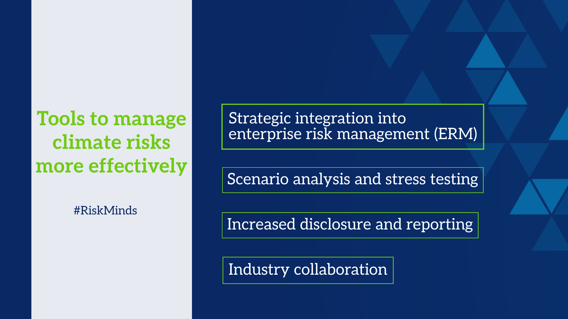 Explore the dangers of greenwashing, reputational risk, transition risk, responsible investment, stress testing, modelling, and more at the RiskMinds Climate Risk & Sustainable Finance Summit.