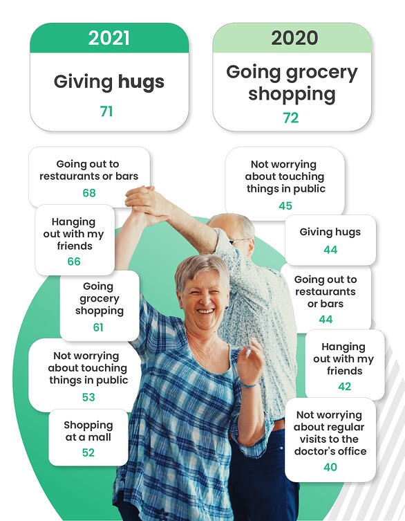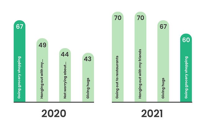 The overarching insight is that people's priorities have moved from the practical to the emotional this year. In 2020, it was all about getting back to those regular aspects of their routine. Something as seemingly ordinary as going grocery shopping was what people yearned for. But a year on, and as restrictions lift, many respondents have been granted the gift of these simple and mundane tasks. Now, it’s about regaining human connection, things they can do with their friends and family.