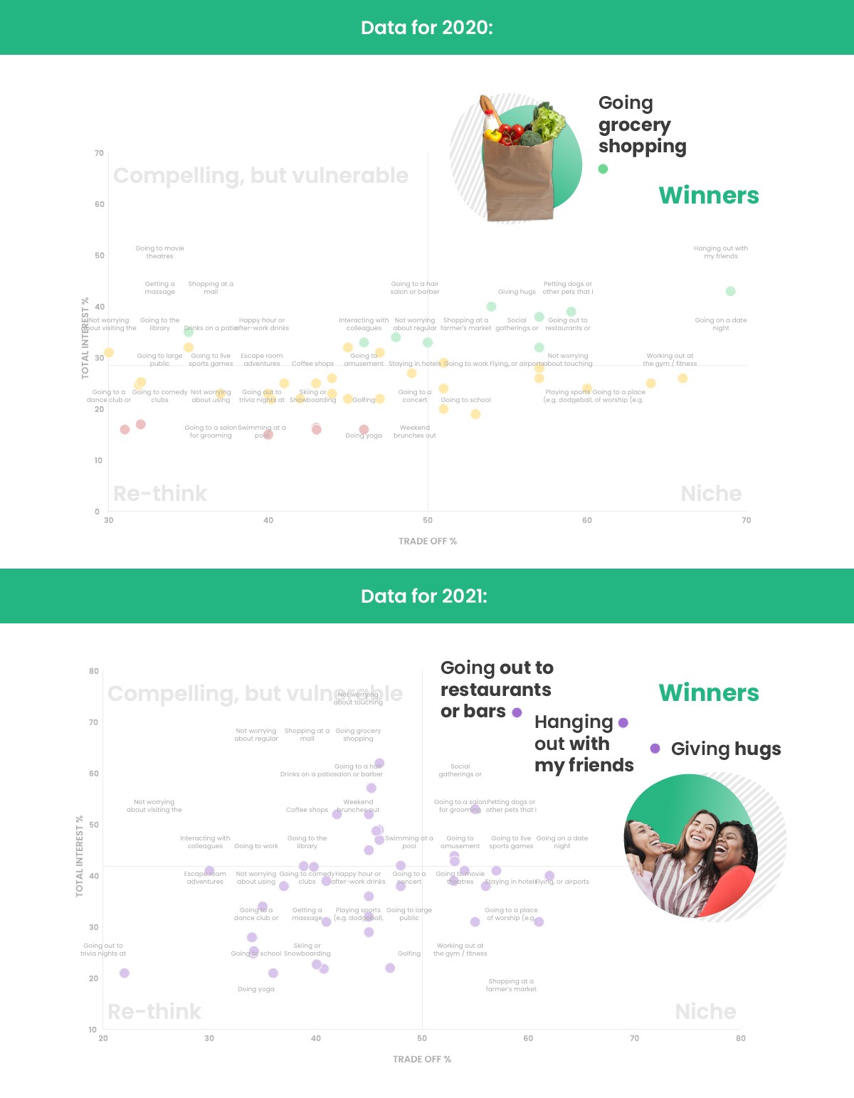 In 2021, the top performers are more emotional. Consider what unites things like 'hanging out with friends', 'going to restaurants and bars' and 'giving hugs'; they mean people and human connection. In contrast, 'going grocery shopping' (a task that’s typically done solo) now sits in the 'Compelling but vulnerable’ quadrant, meaning that respondents found this activity interesting but didn't pick it when pitted against other activities.
