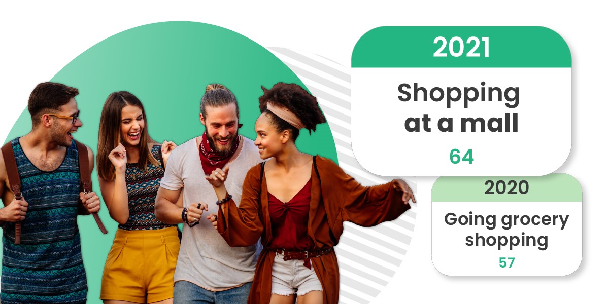 As COVID-19 restrictions gradually loosen up, and more public spaces open in Canada and the US, it looks like younger generations are starting to remember what their life was like in pre-COVID times. ‘Shopping at a mall’ (Upsiide Score of 64) and ‘going to amusement parks’ (64) are in the top 5 most-missed activities for 18-34-year-olds. To compare, these activities ranked 13th and 18th in the 2020 study. This year, ‘going to a concert’ has a Trade-off Score of 64%, which means that this group would rather head to a live concert than ‘go grocery shopping’, which only got a 36% Trade-Off Score.