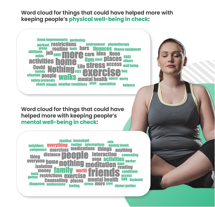 This becomes even more apparent when we look at what might have helped respondents maintain their physical and mental well-being throughout the pandemic; words like ‘exercise’ and ‘activities’ come up in both cases. One of the respondents wrote that “not being mentally stressed out” would have helped them be healthier because this mental state “in turn caused a bit of laziness”. This statement demonstrates the connective tissue between physical and mental health. We should think of health holistically to best understand the results.