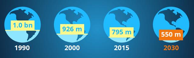 The World Food Programme (WFP) have a big goal - Zero hunger by 2030. Currently 1 in 9 people are chronically hungry, and (as shown in the diagram below) although we are reducing global hunger, it will take more than what we're currently doing to meet this goal. Innovation is required.