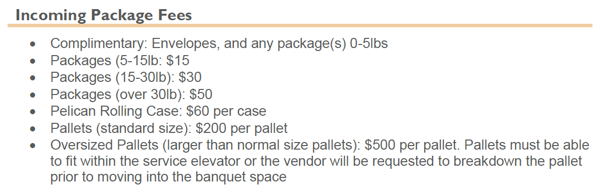 - The hotel charges for all incoming packages. Please see details below. Ahead of the conference, the hotel will send over a credit card authorization form.