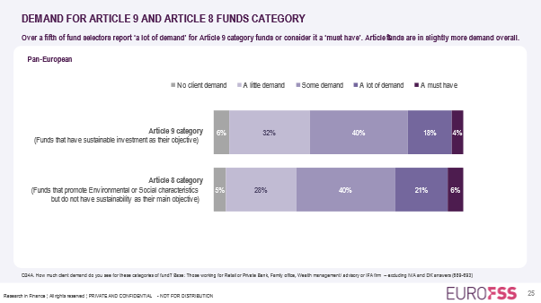 The recently published results of wave 2 of Research in Finance’s European Fund Selector Study (EuroFSS) highlighted robust retail demand across all markets studied for both article 8 and article 9 funds, the ‘lighter green’ and ‘darker green’ products falling within scope of the EU’s Sustainable Finance Disclosure Regulation (SFDR).