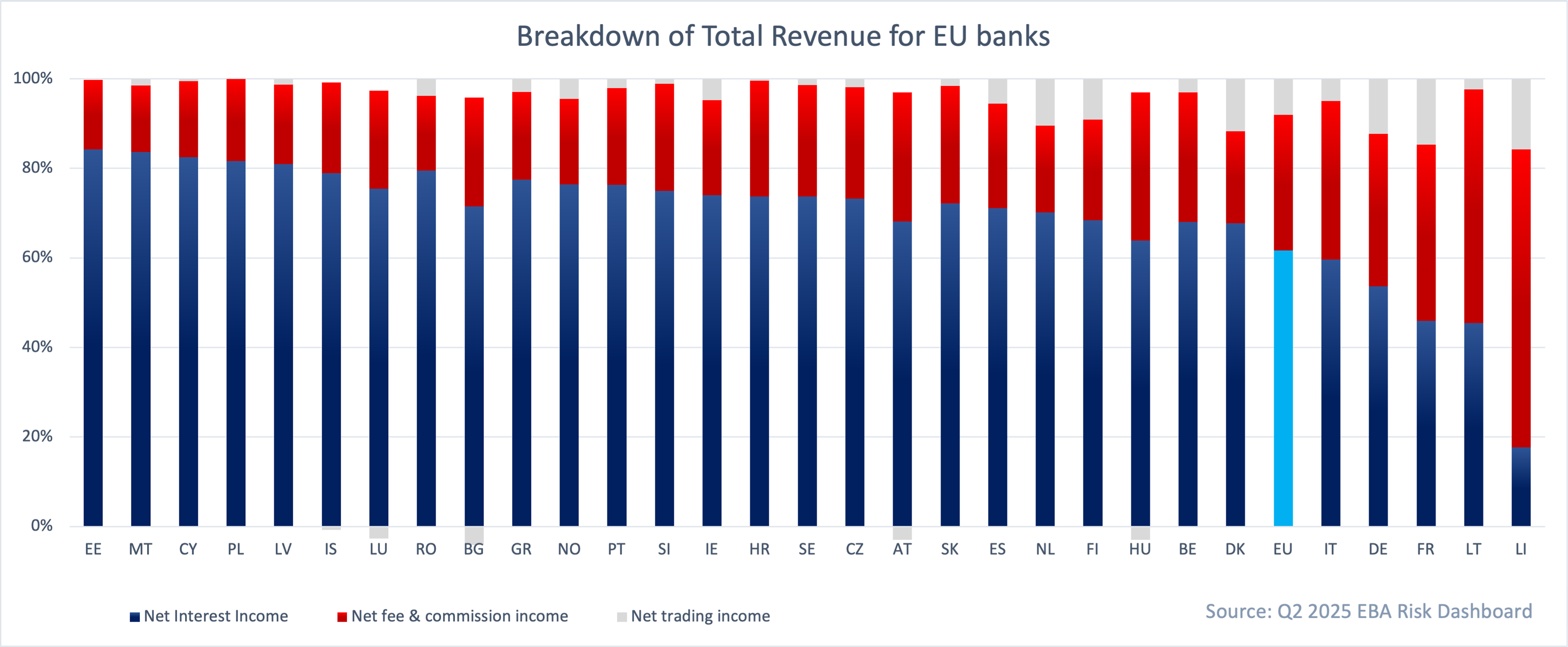 On the 1st anniversary of SOT NII, we share our candid thoughts on how it is already distorting the way EU banks manage interest rate (IR) risk. Whilst there are some noticeable differences between EU countries when it comes to banks’ reliance on NII (see Chart 1), naturally NII is the key revenue driver. Therefore, the policy that redefines how banks manage NII is essential to ensuring the resilience and competitiveness of the EU banking sector and must be robust and well-founded.