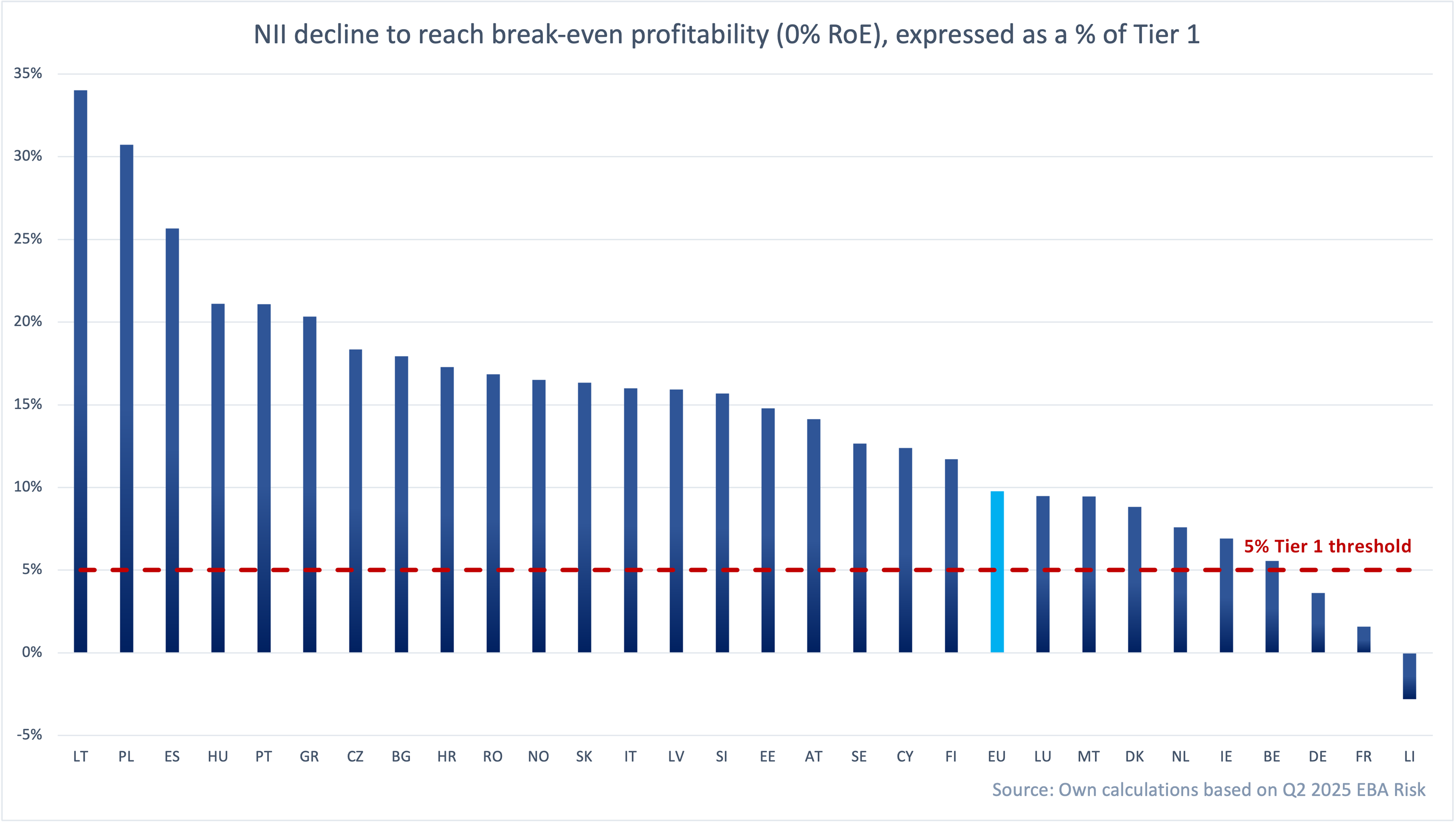 Chart 2: NII decline to break-even (0% RoE) as a % of Tier 1