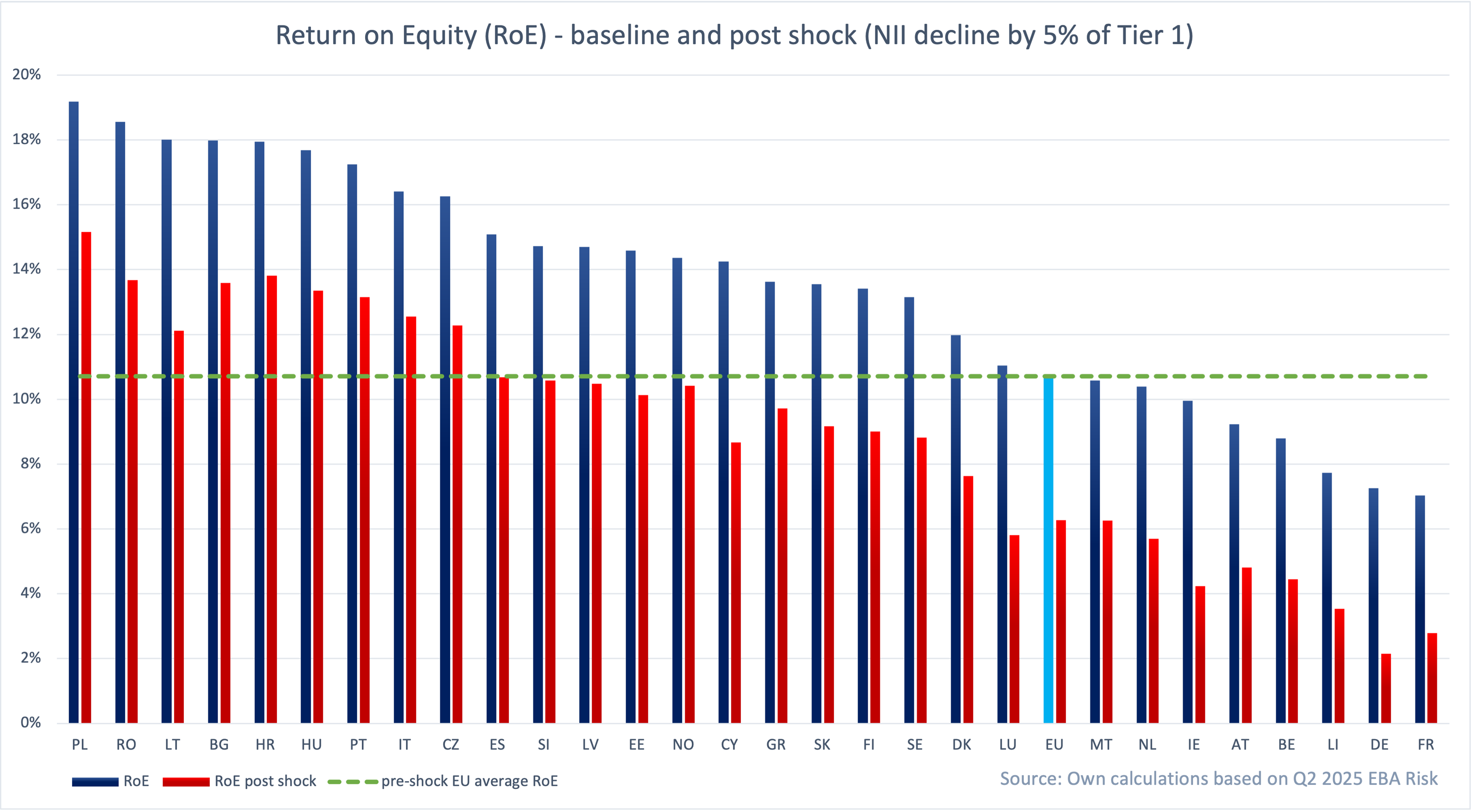 Chart 3 shows Return on Equity (RoE) numbers from the Q2’25 EBA Risk Dashboard and our estimates of RoE following a drop in NII (a 5% of Tier 1 drop). For 9 countries post-shock, RoE is larger than pre-shock EU average RoE. Those countries include Czechia, Italy, Portugal and Croatia.