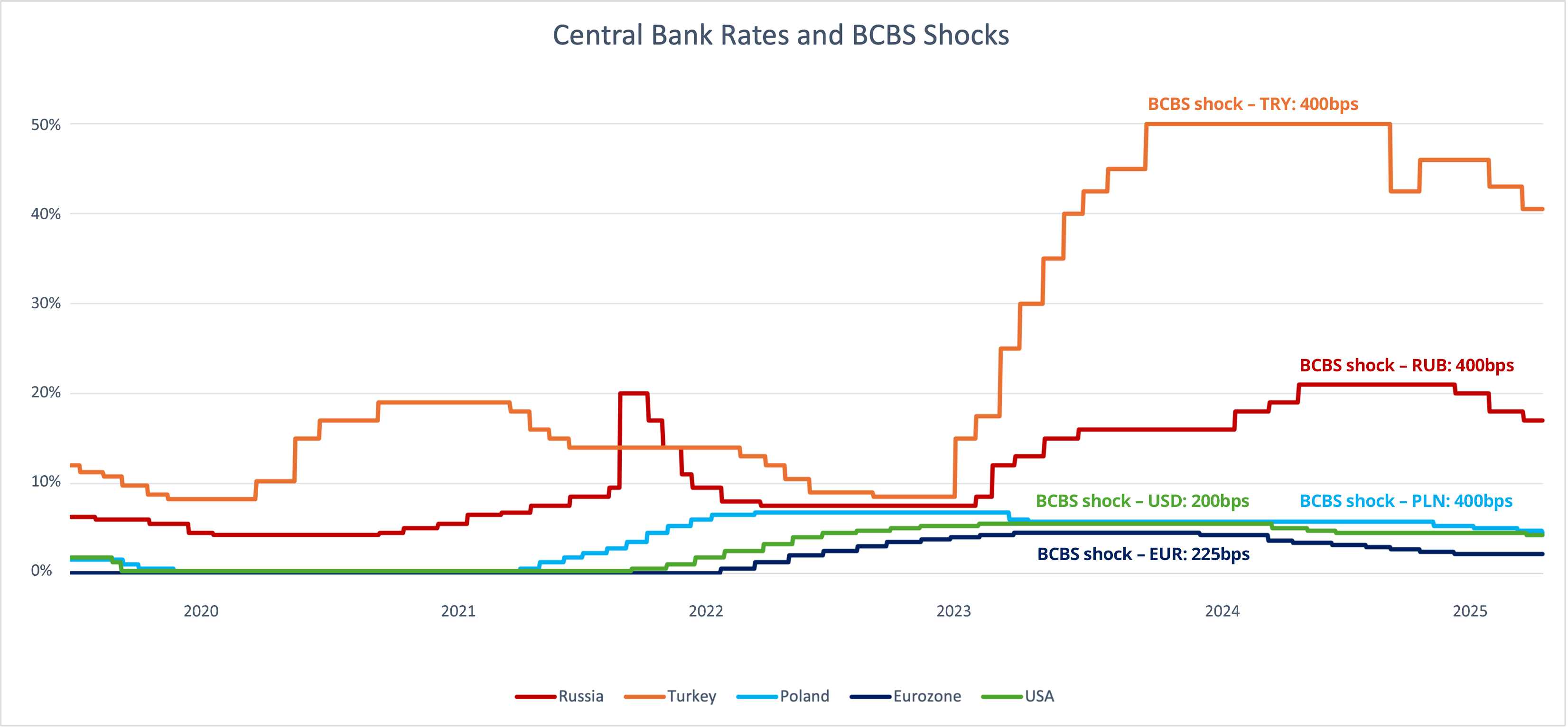 The recalibration results in substantial increases in shock sizes for several currencies. For example, HUF and PLN experienced 60% increases from 250bps to 400bps, whilst CZK, SAR, and SEK saw increments of 75bps to 275bps, and CHF increased by 75bps to 175bps (see Appendix for the full list). Notably, the increase to 400bps for PLN aligns it with shocks applied in such volatile IR markets as TRY and RUB, which, as depicted in the graph below, exhibits very different interest rate dynamics.