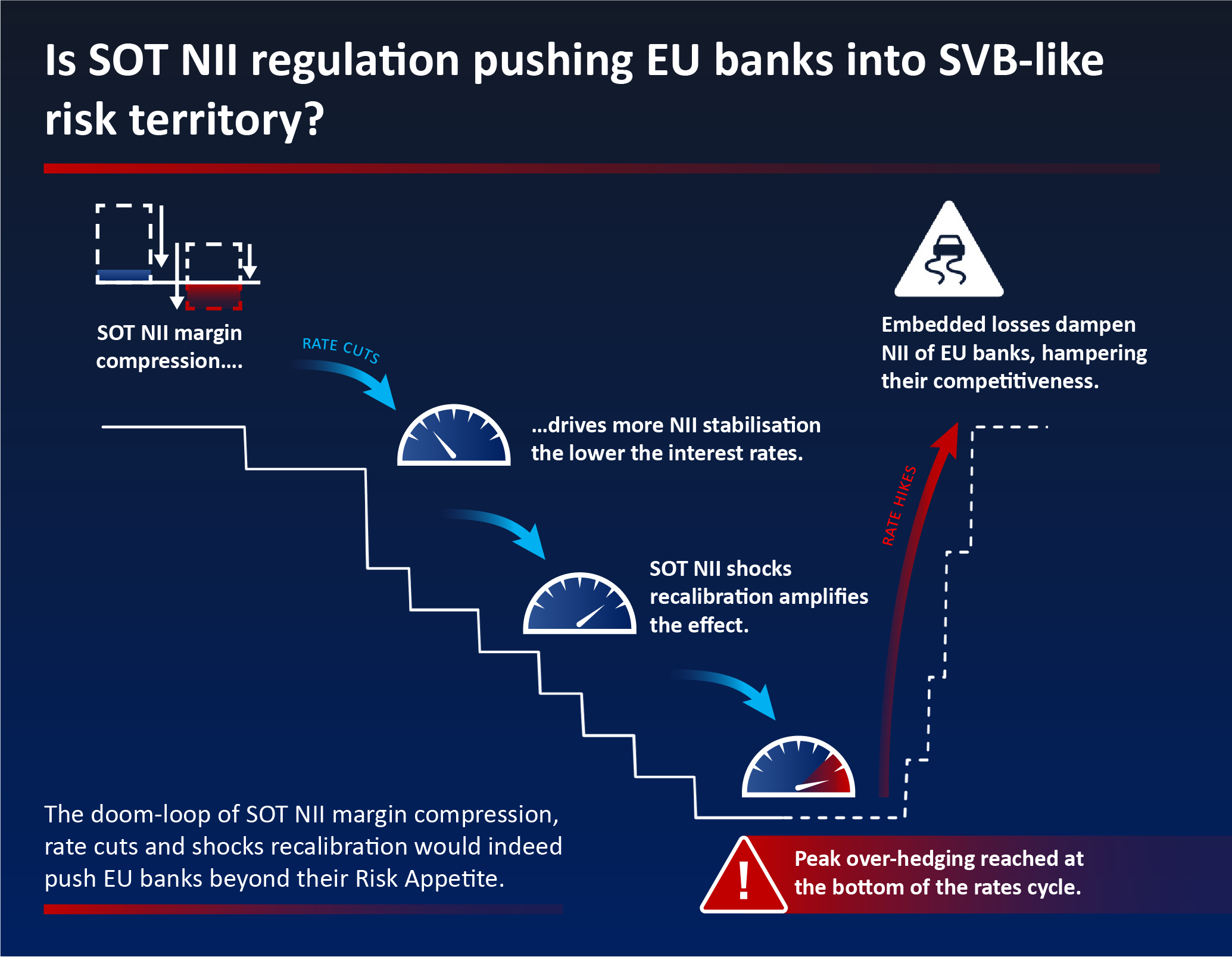 Given the significant consequences of this strategy in an environment of rising rates, we do not regard this approach as a prudent one. Furthermore, we believe it does not align with the intended objectives of the IRRBB regulatory framework. Chart 6 (below) illustrates how the doom-loop of SOT NII margin compression, rate cuts and shocks recalibration would push EU banks beyond their risk appetites, towards SVB-like risks.