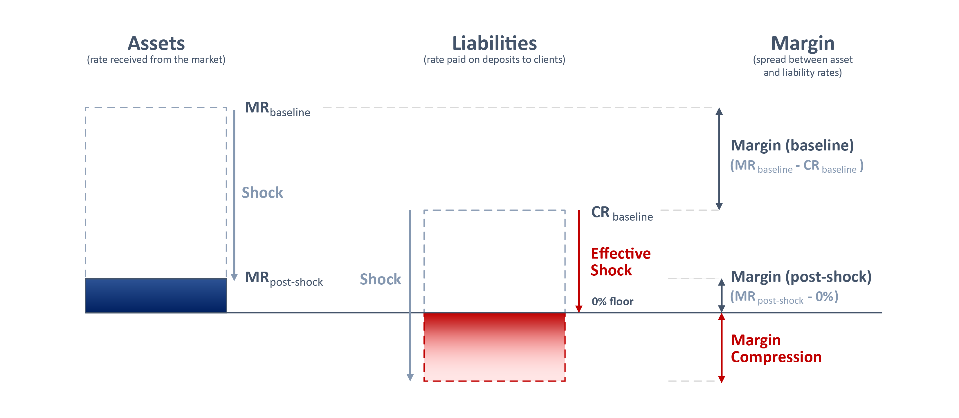 Let’s consider a hypothetical bank, with retail and corporate deposits on the liabilities side of its balance sheet. Let’s assume this bank has perfectly tenor-matched assets on the other side. Assets earn Market Rate (MR). Deposits cost Client Rates (CR). Bank’s NII, on this part of the balance sheet, equals to MR-CR. Following a downward shock, assets pay less i.e. MR – shock and deposits cost less, i.e. CR – shock (floored at 0%, assuming the bank doesn’t charge clients for deposits). As long as rates are high (high point of IR cycle) everything moves in tandem. Reduced income is offset by lower costs and there is no SOT NII impact (IR risk is closed). However, when rates are low (low point of IR cycle), with the 0% floor on deposits, the shock to the income side is not fully offset by lower deposit costs. As a result, the “margin compression” effect transpires, introducing asymmetry and driving SOT NII utilisation. See Chart 4 below. Why do we bother about that?