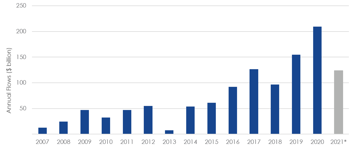 Another area of growth may be sustainable fixed income investing through ETFs. Assets in sustainable fixed income ETFs nearly tripled from $7.6 billion at the end of 2019 to $21.2 billion by end of 2020[6]. Investors trying to navigate the complexities of ESG may find data driven sustainable indexed exposure more transparent and easy to access via ETFs. The green and sustainable debt market continues to grow and may top $650 billion in 2021, representing growth of 32% over the previous year[7]. Despite the sheer growth in green bonds issuance it has been difficult for most investors to access these bonds, whose proceeds are used to achieve a positive impact, including carbon reduction. Investors looking to add green bond exposure to their portfolios might find rules based and transparent ETFs useful. These ETFs are built on indices that maintain stringent inclusion standards that provide exposure to bonds financing environmentally impactful projects. This approach can overcome some of the challenges of applying more subjective, and often inconsistent, issuer-level ESG-ratings to a bond portfolio. We may also see product innovation driving growth in other traditional fixed income asset classes, such as sustainable approaches to investing in municipal bonds markets.
